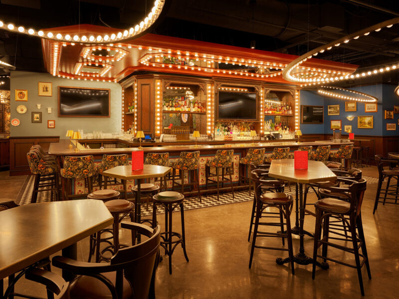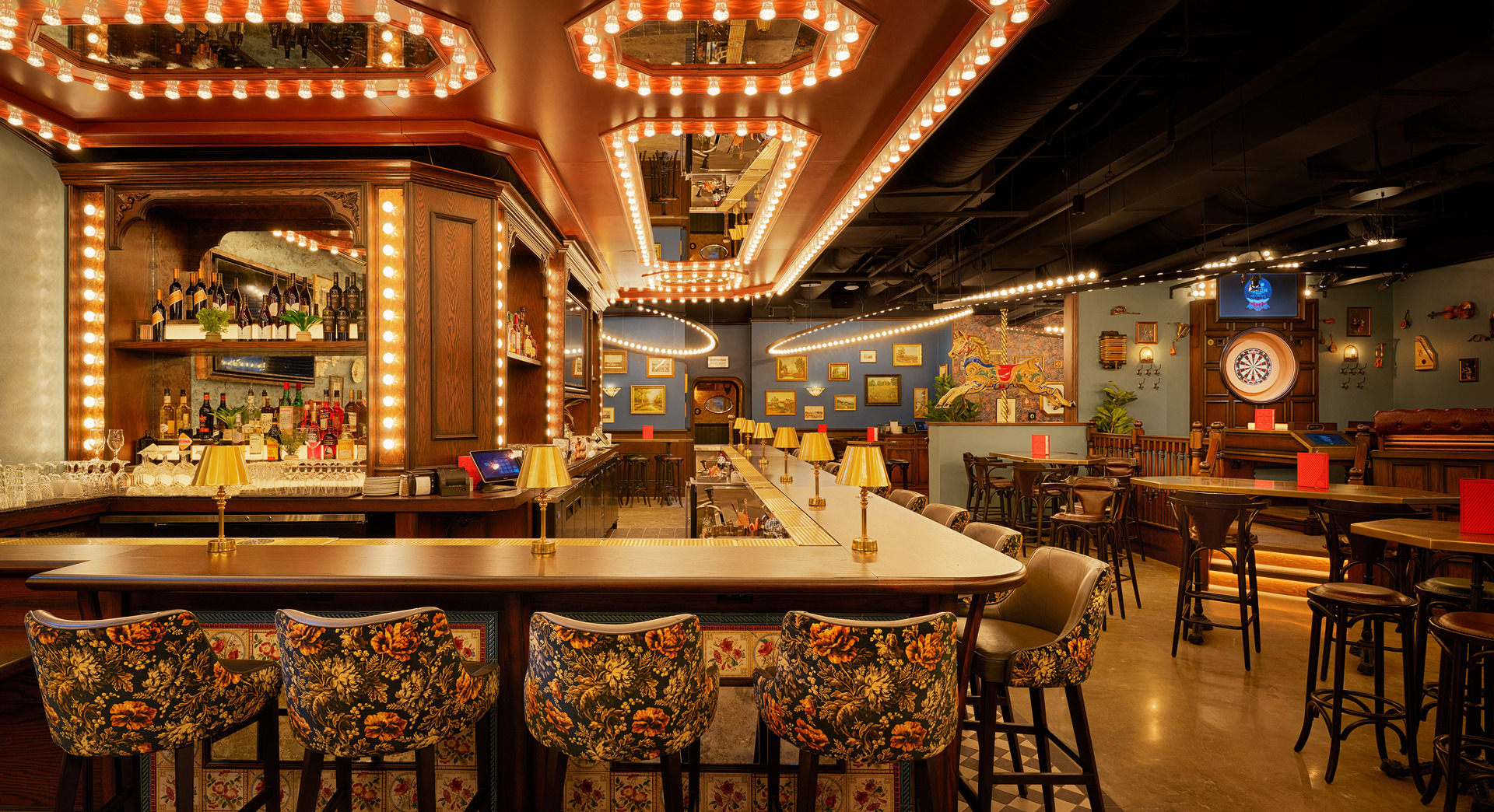 Inspired by the charm of a Victorian-era pub and the whimsy of British fairgrounds, the interior is warm, inviting, and playful. Decorative elements sourced across England reinforce an authentic and immersive atmosphere. Overhead, large suspended ring lights infuse the space with energy, enhancing social interaction. The central bar, featuring cabochon lights and surrounded by black-and-white checkered tile, establishes a vibrant focal point that defines the heart of the venue.
